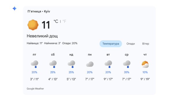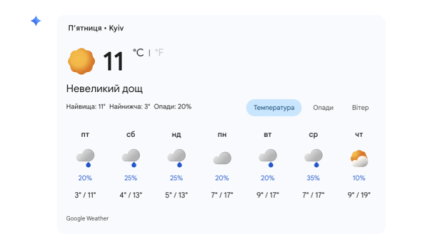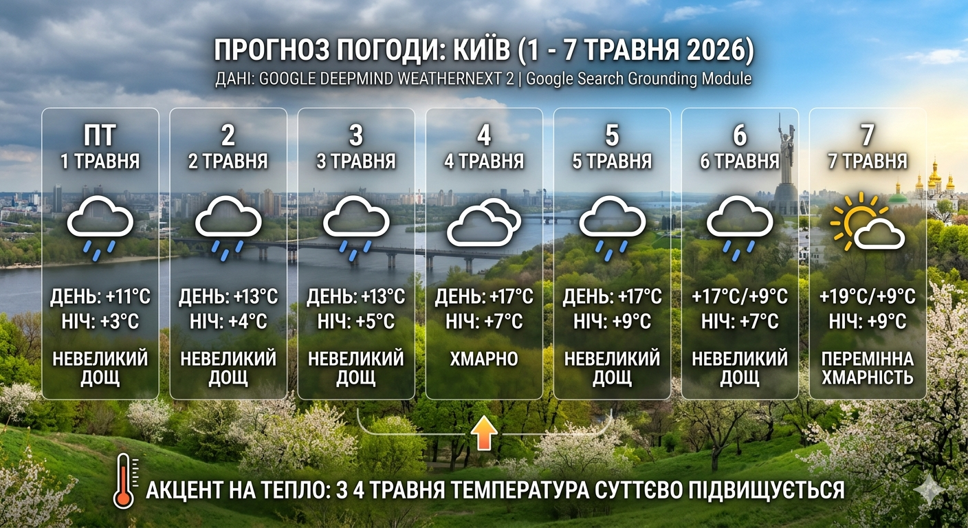 Водночас, дані Українського гідрометеорологічного центру суттєво відрізняються від розрахунків штучного інтелекту, прогнозуючи значно стриманіше потепління. Синоптики попереджають, що перші дні травня будуть прохолодними: з 1 по 3 травня температура вдень не підніметься вище +8…+9°C, а дощі супроводжуватимуть киян протягом усіх вихідних. Навіть із середини тижня, за даними Гідрометцентру, стовпчики термометрів зафіксуються на позначках +12…+13°C, що помітно нижче за оптимістичні прогнози моделі WeatherNext 2.