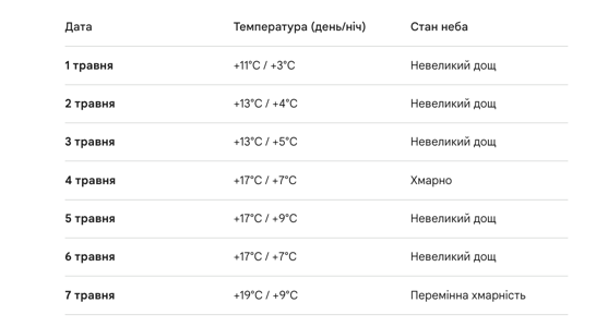 Ситуація почне змінюватися вже з понеділка, 4 травня. Саме цей день стане точкою відліку для справжньої весни, коли хмари почнуть розсіюватися, а повітря прогріється до +17°C. Попри те, що 5 та 6 травня ще можливі залишкові невеликі дощі, температурний режим уже не опускатиметься нижче за позначку в сімнадцять градусів тепла.