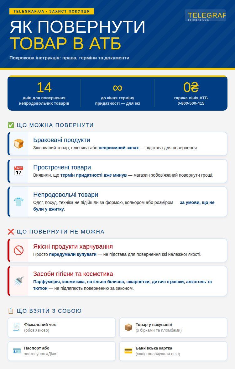 Побутує міф, що їжу повернути неможливо. Це не зовсім так. Якщо ви придбали в "АТБ" товар неналежної якості(наприклад, розгерметизована консерва, пліснява всередині пакування або товар з протермінованою датою придатності), магазин зобов’язаний або замінити його на свіжий, або повернути гроші.