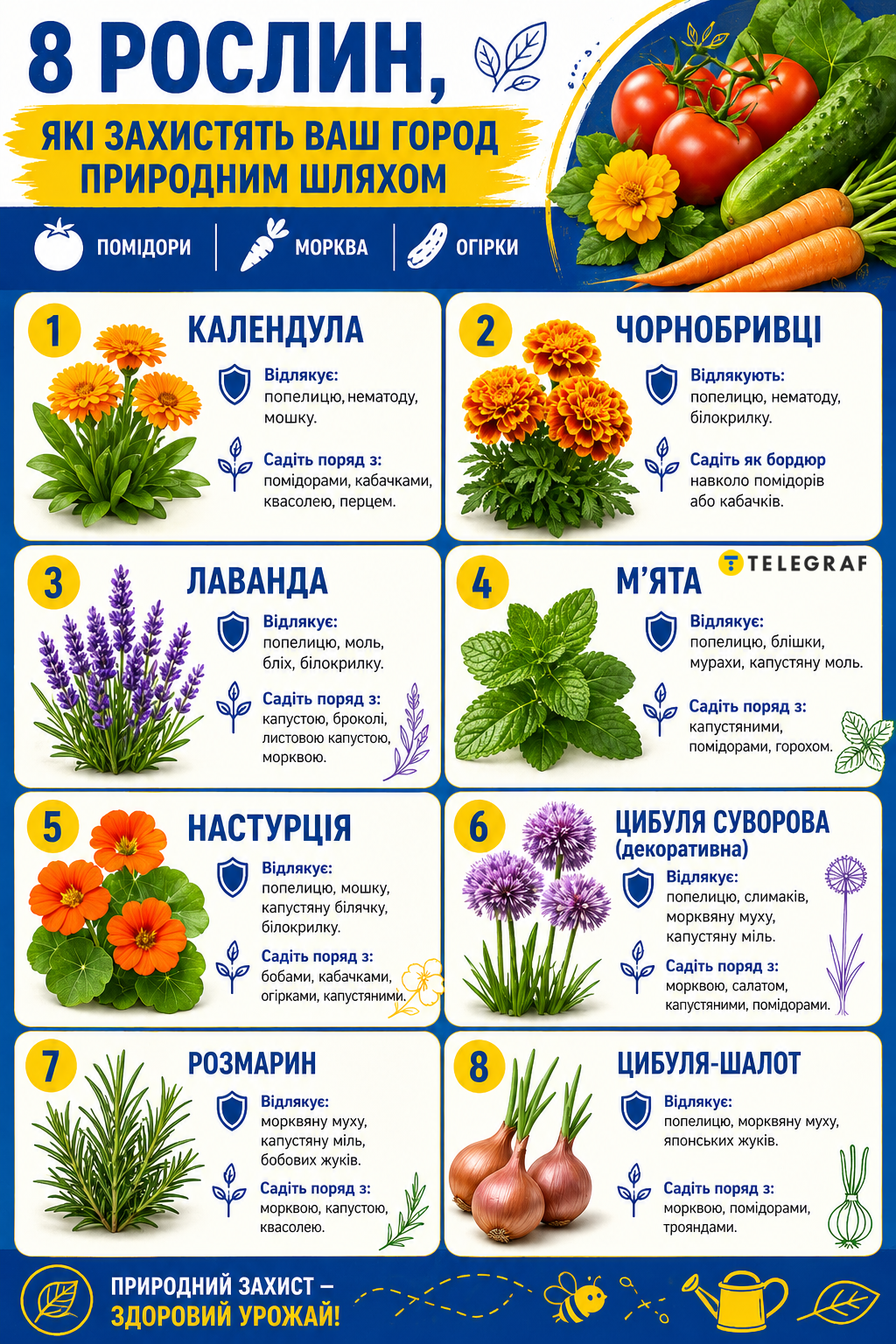 Рослини, що відлякують шкідників з саду та городу. Інфографіку підготовлено за допомогою ШІ