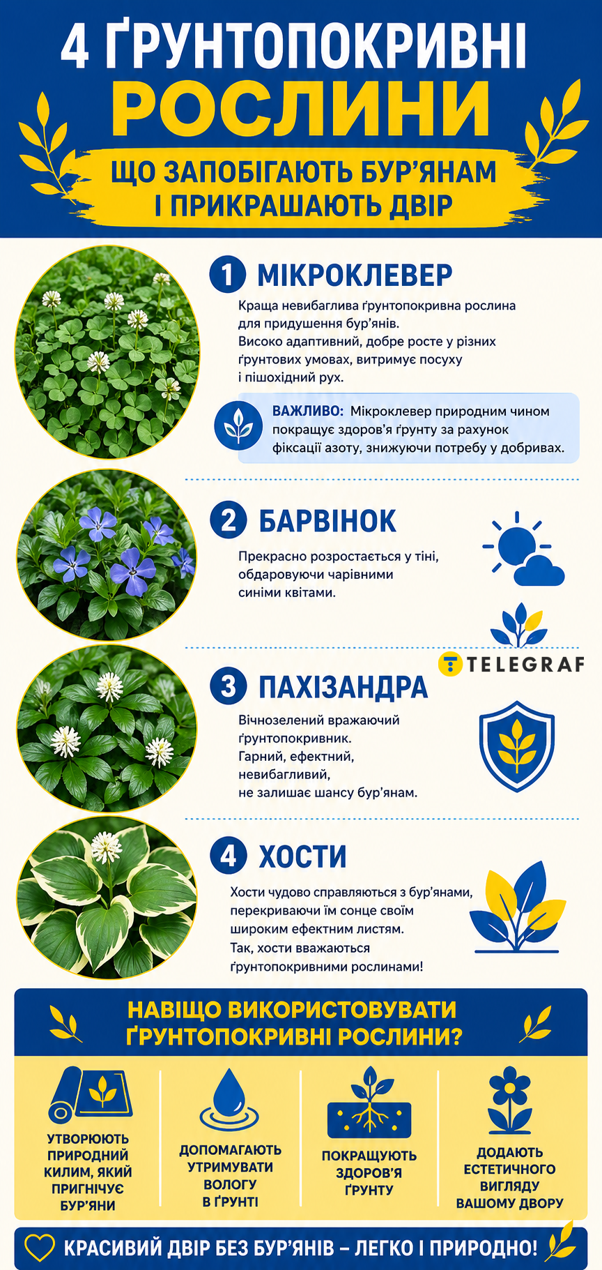 Натомість, подумайте про посадку красивих ґрунтопокривних рослин, які запобігають проростанню бур’янів і одночасно покращують зовнішній вигляд вашого двору. Пропонуємо 4 варіанти на ваш вибір.