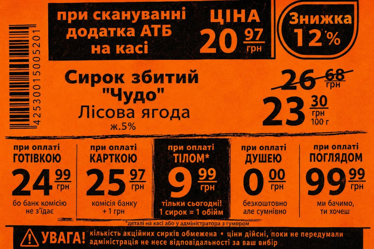 Мережа супермаркетів АТБ вирішила заохотити покупців частіше користуватися своїм мобільним додатком, пропонуючи спеціальні ціни при скануванні QR-коду на касі. Проте народна творчість пішла набагато далі за звичайний маркетинг. У мережі завірусився "секретний" цінник на сирок "Чудо", який пропонує таку варіативність оплати, що навіть крипта відпочиває.