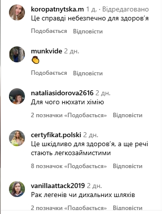"На себе кучу всяких мазюк мажуть, стірають куча кондиціонерів всяких в повітря в хаті теж куча всяких освіжувачів, а потім дивуються де беруться різного типу алергії особливо у дітей";