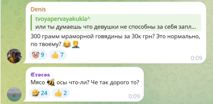 В коментарях обурилися й цінами, й тим, що дівчата витратили таку суму за один похід у ресторан. Хтось іронізує, що такий обід можна взяти в оплату частинами. Дехто пише, що насправді мармурова яловичина коштує дешевше. У відповідь їм пояснили, що в ціну входить й те, що це м'ясо готують при тобі, роблячи з цього шоу.