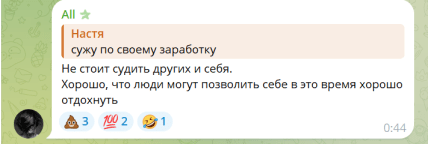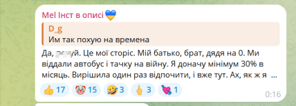 Інші пишуть, що краще б дівчата хоча б половину цієї суми задонатили на ЗСУ. Однак в коментарі прийшла дівчина, яка заявила, що це нібито її відео й вона одна з дівчат на ньому. За її словами, її родичі на передовій, а сама вона передає ЗСУ щомісяця 30 відсотків свого доходу, й нібито вирішила "раз відпочити".