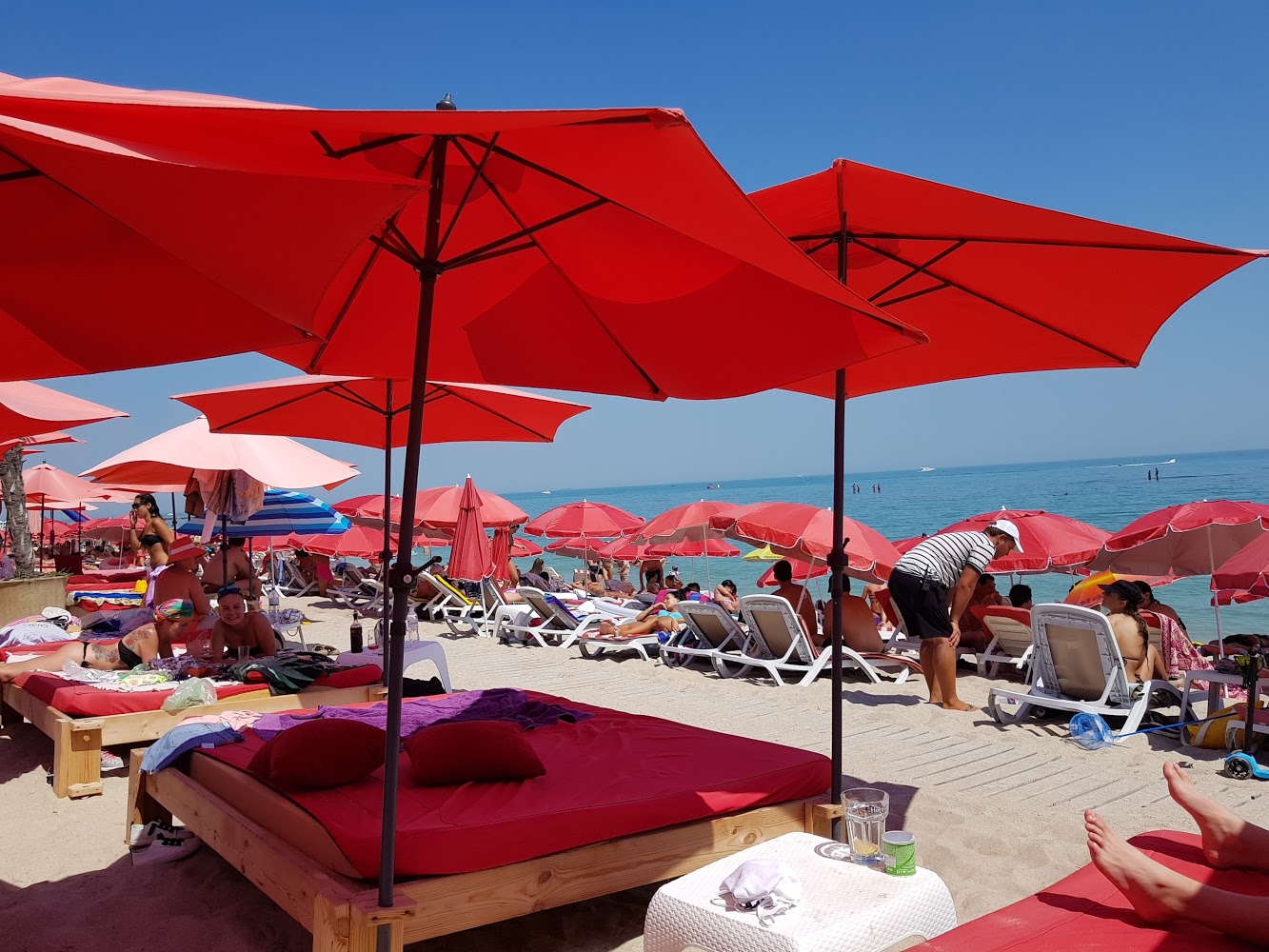 Територія пляжу велика та має кілька зон. Можна орендувати шезлонги чи м'які куточки. Для дітей обладнаний дитячий майданчик - гірки, гойдалки, батути.