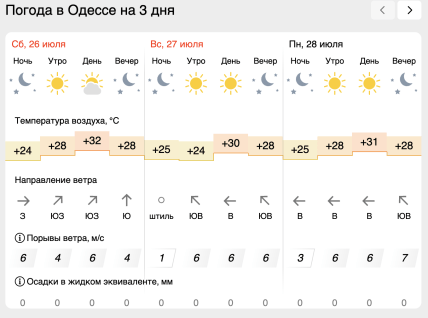 Додамо, що станом на 26 липня в Одесі температура становить до +32 градусів, а 27 та 28 липня не повинна перевищувати +30 градусів.