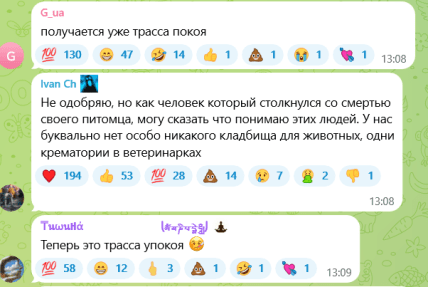 Але серед усього цього звучить і раціональна думка — що міська влада мала б офіційно виділити місце для поховань тварин. Один користувач справедливо зазначив, що якщо не дати людям законної альтернативи, подібні ініціативи з'являтимуться спонтанно — там, де емоції виявляться сильнішими за правила.