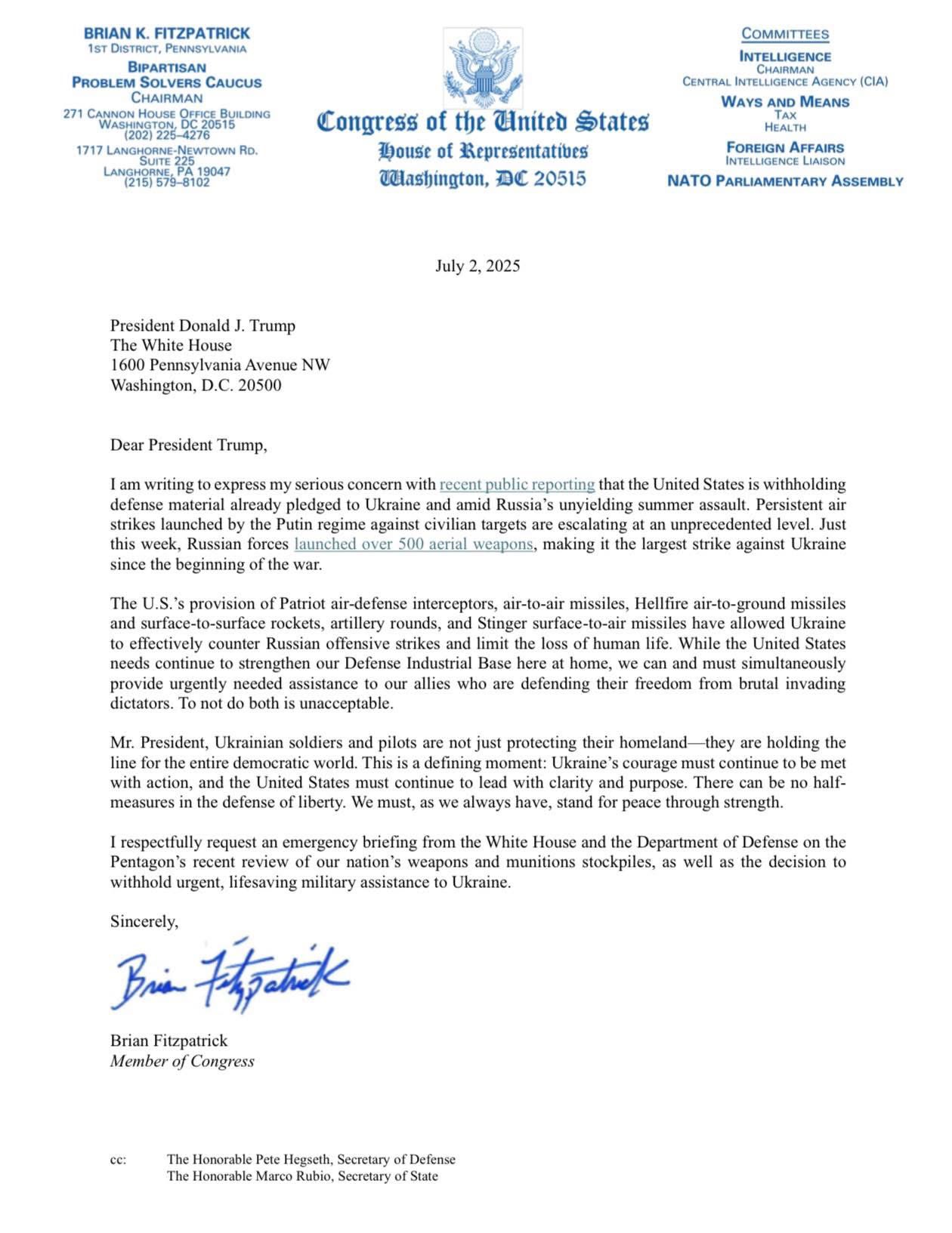 Про це написав сам Фіцпатрік у своєму X (Twitter). Конгресмен повідомив, що новини про призупинення допомоги Україні викликали в нього "серйозне занепокоєння", оскільки Україна четвертий рік веде важку війну, а Росія посилила повітряні атаки на українські міста.