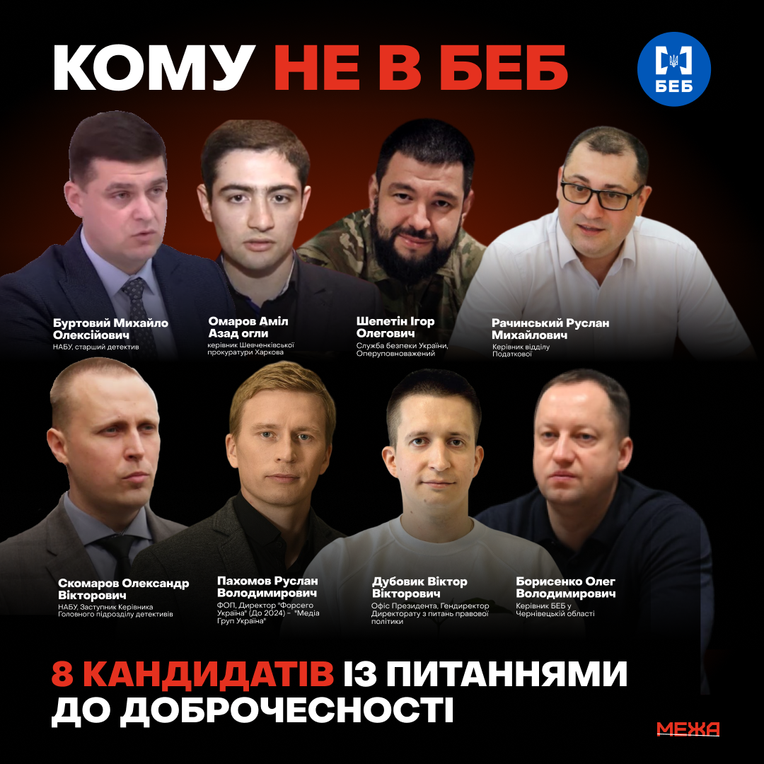 Під час первинного відбору в березні на посаду керівника БЕБ подались 43 кандидати. Тринадцятьох відкинули одразу, згодом у фінал пройшли 16. За даними антикорупційного центру Межа, щодо восьми з них виникали серйозні питання стосовно доброчесності. Зокрема, Михайло Буртовий задекларував шалені заощадження, а його мама, маючи мізерні заробітки, купила 60 земельних ділянок і 2 авто. Олександр Скомаров теж задекларував явно недостовірні дані — його мама, яка отримувала дохід 2500 доларів, купувала та перепродувала квартири на десятки тисяч доларів. Сестра Скомарова фігурує у НАБУ, а він виступив поручителем у її справі. А батько його взагалі має російське громадянство і веде бізнес в так званій "ЛНР".
