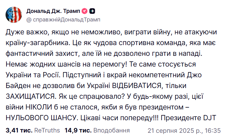 "Дуже складно, якщо не неможливо, виграти війну, не нападаючи на країну-загарбника. Це як сильна спортивна команда, яка має фантастичний захист, але якій не дозволено грати в нападі. Шансів на перемогу немає! Те саме з Україною та Росією", — написав Трамп.