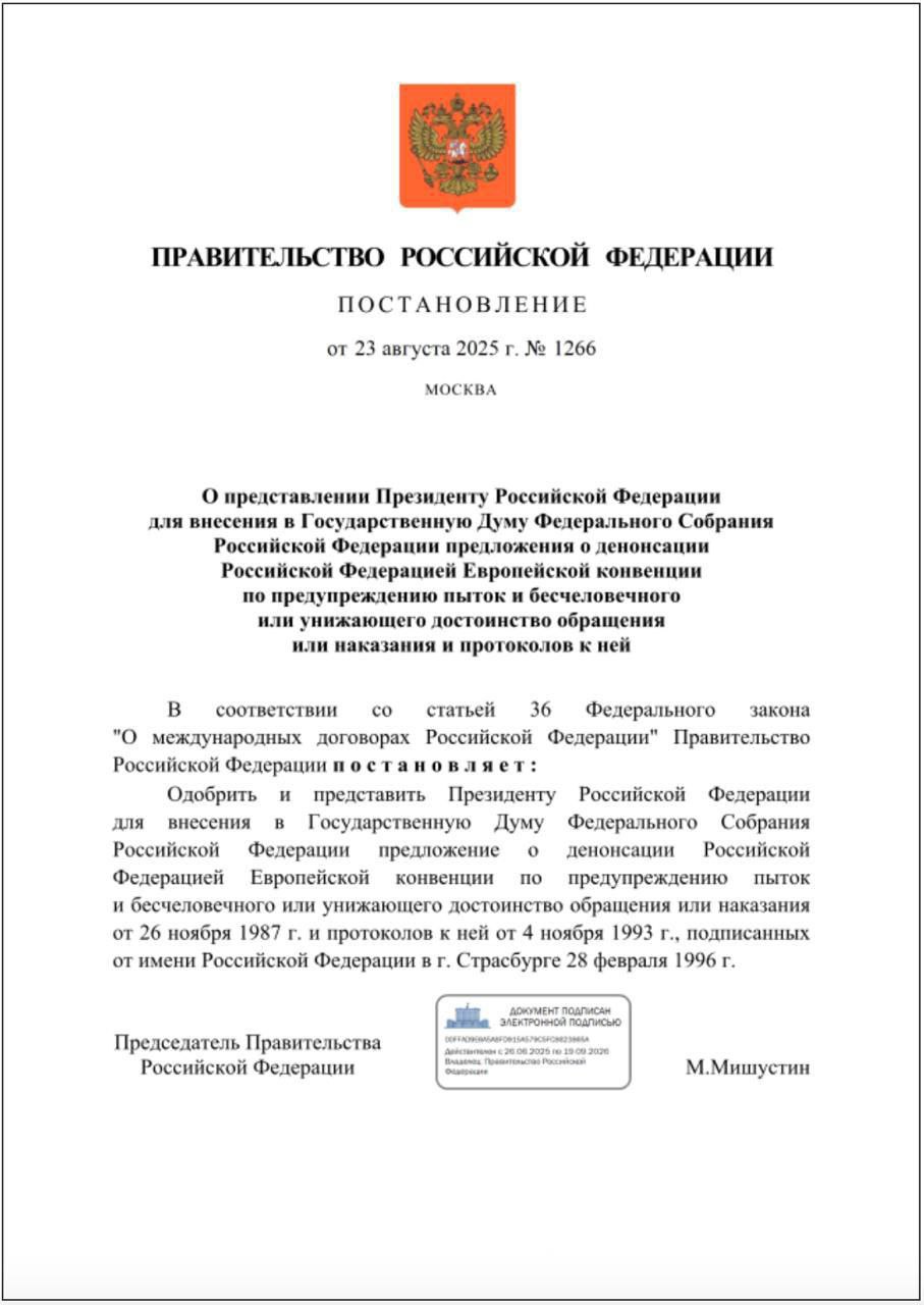 "Схвалити та представити президенту Російської Федерації для внесення у Державну Думу Федеральних Зборів Російської Федерації пропозицію про денонсацію Російською Федерацією Європейської конвенції про запобігання катуванням чи нелюдському або такому, що принижує гідність, поводженню чи покаранню від 26 листопада 1987 року і протоколів до неї від 4 листопада 1993 року, підписаних від імені Російської Федерації у м. Страсбурзі 28 лютого 1996 року", — сказано у постанові.