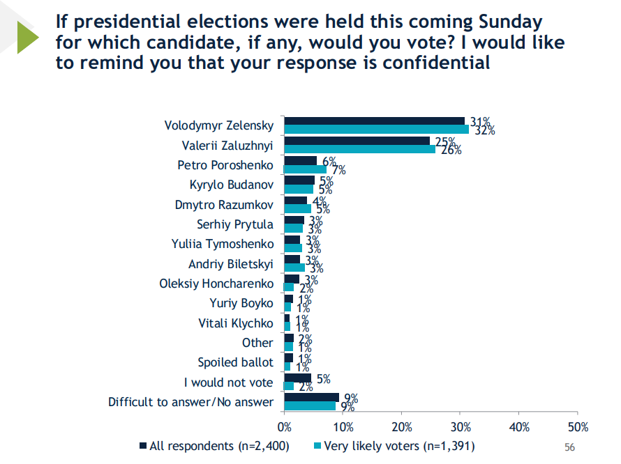 Згідно з даними, 31 відсоток респондентів готові проголосувати за Зеленського, 25 відсотків – за Залужного, 6 відсотків – за п’ятого президента Петра Порошенка, а 5 відсотків – за начальника ГУР Кирила Буданова. Діяльність чинного президента загалом оцінюють позитивно: 33 відсотки висловили повне схвалення, ще 32 відсотки – часткове, тоді як 16 відсотків категорично не підтримують його політику.