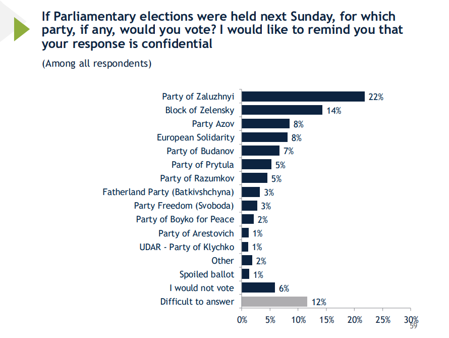 У разі виборів до Верховної Ради 22 відсотки опитаних готові підтримати умовну "партію Залужного". За "блок Зеленського" висловилися 14 відсотків, по 8 відсотків готові голосувати за партію "Азов" та "Європейську солідарність", а за політичну силу під проводом Буданова – 7 відсотків.
