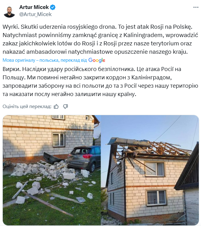Відомо, що від дронів постраждали приватні домоволодіння. Польський військовий експерт та політолог Артур Міцек наголошує, що Польща має негайно діяти, зокрема — закрити кордон.