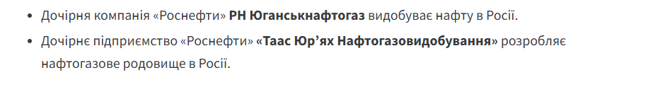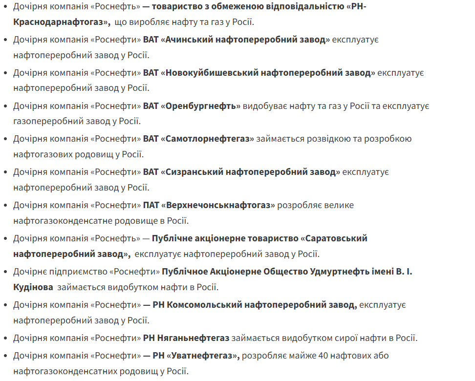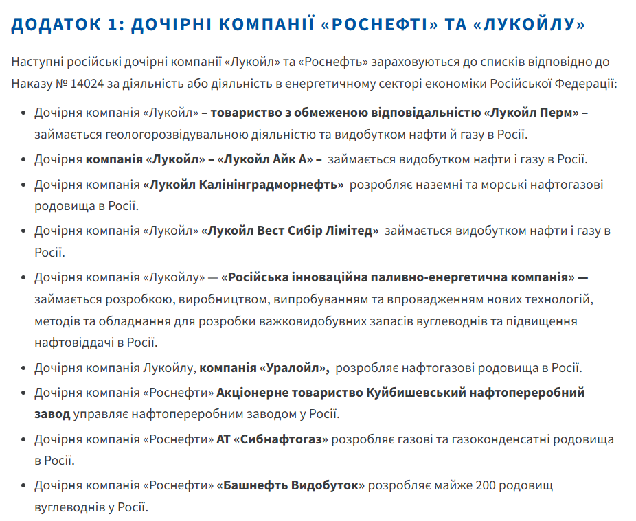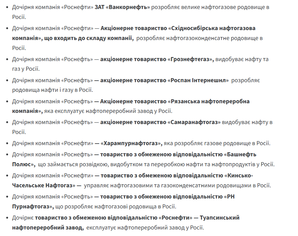 Перш за все, обмеження ввели проти головних компаній — "Роснєфть" та "Лукойл". Також під обмеження потрапили усі їхні дочірні структури, компанії та фірми. Усі активи зазначених компаній в США буде знерухомлено. Будь-які транзакції з ними суворо заборонені. Список компаній, що потрапили під санкції, в Мінфіні опублікували окремим додатком: