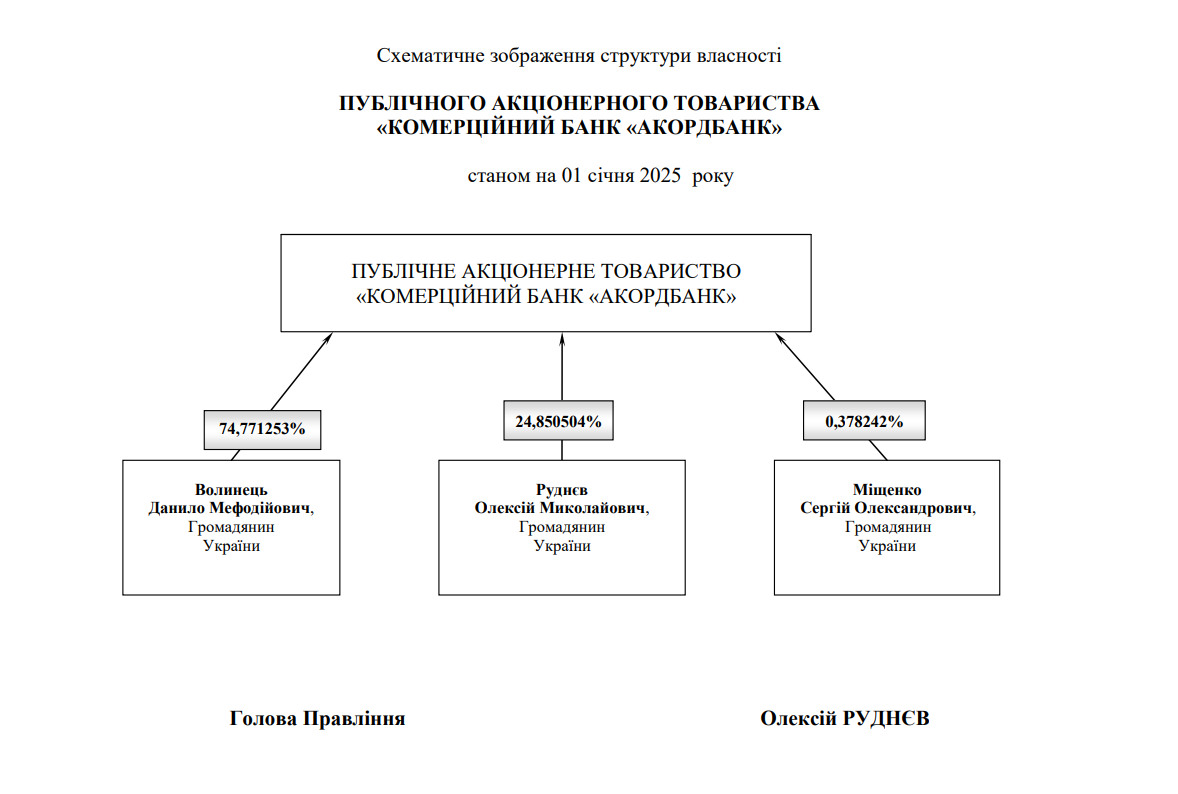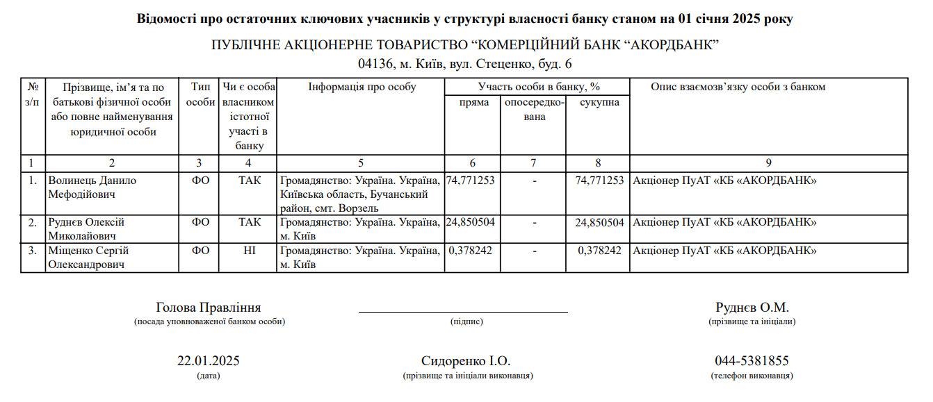 Пані Маркарова тривалий час працювала на посаді надзвичайного і повноважного Посла України в США й хоча була звільнена наприкінці серпня 2025 році, утім, багатьом здається, що її призначення в ОП може бути підтримане західними політиками. Та найважливіше в даному контексті те, що вона є дружиною бізнесмена Данила Волинця, який є головою наглядової ради Акордбанку та його найбільшим акціонером. За останнім даними Нацбанку, Волинцю належить 74,8% акцій цієї фінустанови. Згідно ж Сімейного кодексу України, майно подружжя ділиться 50/50, й за ним Оксана Маркарова є опосередкованою співвласницею банку.