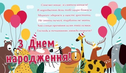Спеціально для своїх читачів "Телеграф" створив оригінальні життєрадісні листівки з днем народження дитині. Роздрукуйте та прикипіть картинку, що сподобалася, до подарунка, або відправте імениннику, якщо він вже користується месенджерами або соцмережами. Вітальну листівку також можна надіслати батькам малюка.