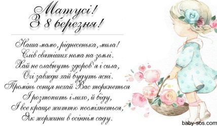 Дорога та улюблена матуся, вітаю тебе з 8 Березня. Хочу, щоб ти була завжди здорова та щаслива. Щоб ніщо і ніколи не могло зіпсувати тобі настрій. Пам’ятай, що я тебе дуже люблю!