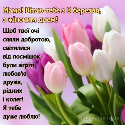 З 8 Березня, матуся. Бажаю тобі, моя рідна, завжди цвісти від щастя і гарнішати від кохання. Нехай це чудове свято весни зігріє тебе промінчиками ніжності та натхнення, нехай у твоєму житті завжди будуть яскраві барви радості та доброти. Бажаю тобі здоров’я та сил, великих успіхів без втоми та розчарувань.