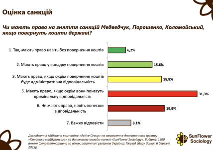Майже 20% вважають, що санкції не можна знімати за жодних умов, навіть, якщо фігуранти понесуть відповідальність. Водночас лише 6,2% українців підтримують скасування санкцій.