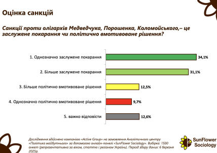 "Санкції проти олігархів Медведчука, Порошенка та Коломойського вважають заслуженим покаранням 65,2% українців, з них 34,1% – "однозначно заслуженим", а 31,1% – "більше заслуженим", – йдеться в результатах дослідження.