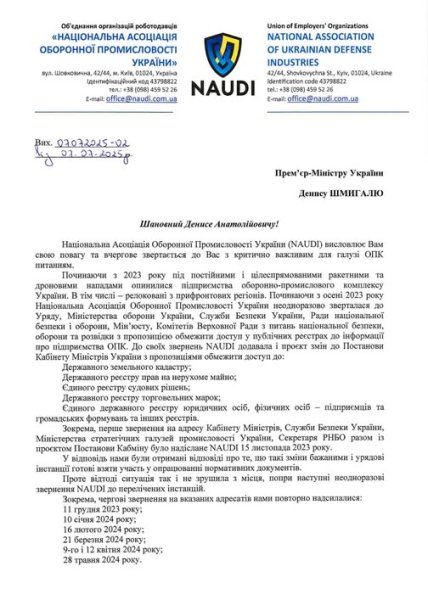 Національна Асоціація Підприємств Оборонної Промисловості України (NAUDI) звернулася до прем’єр-міністра України Дениса Шмигаля з проханням особисто втрутитися у критичну для галузі ситуацію — питання публічного доступу до чутливої інформації про підприємства оборонно-промислового комплексу.