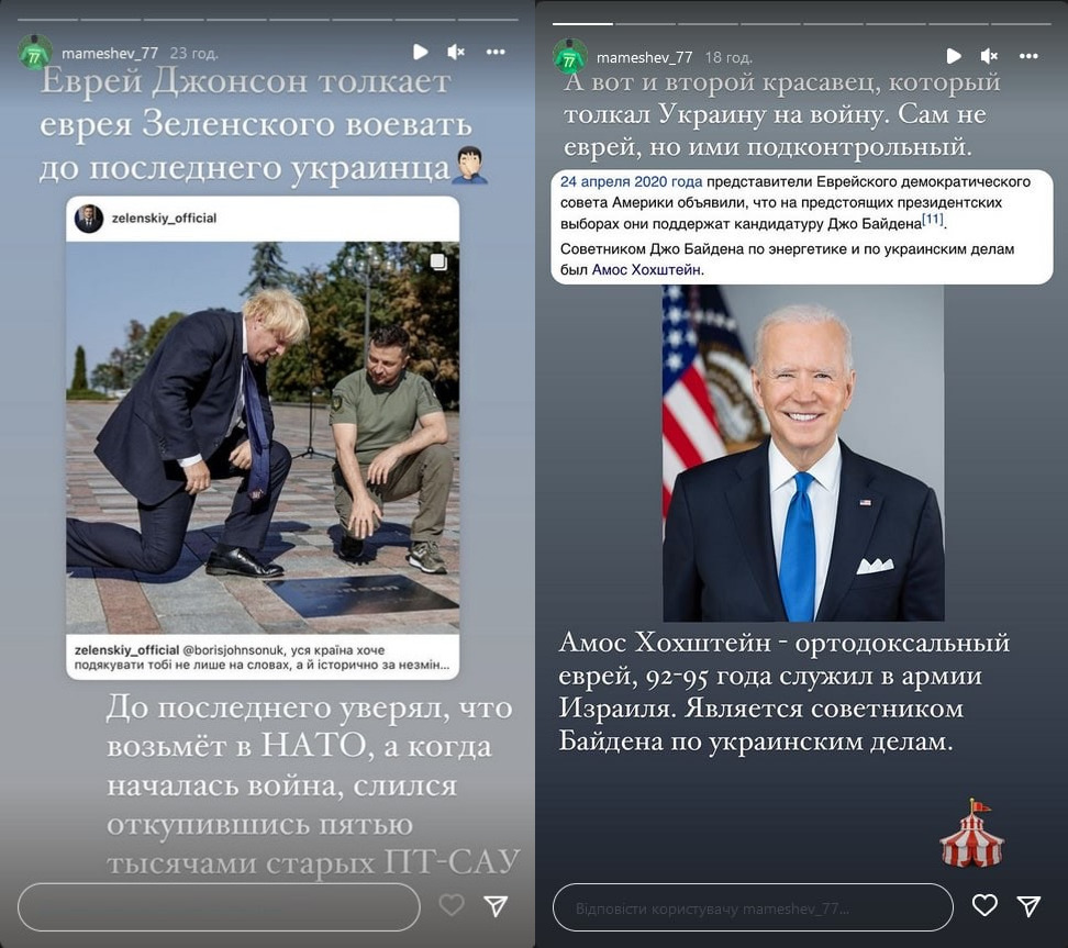 Також в мережу виклали скриншоти в зі старих сторіз, які можна сприймати як прояв антисемітизму Мамешева. Зокрема, він пише про "еврея Джонсона, который толкает еврея Зеленского воевать до последнего украинца" та публікує списки євреїв серед американської влади.