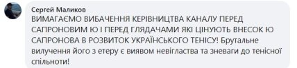 У соцмережах користувачі масово підтримують Сапронова з огляду на його значну допомогу захисникам Харкова після початку повномасштабного вторгнення РФ в Україну, а також величезну роль у розвитку тенісу в країні. Також у мережі вимагають вибачень від телеканалу.
