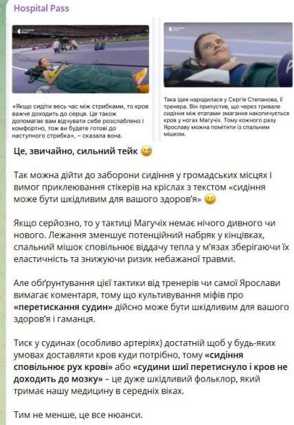 "Якщо серйозно, то у тактиці Магучіх немає нічого дивного чи нового. Лежання зменшує потенційний набряк у кінцівках, спальний мішок сповільнює віддачу тепла у мʼязах зберігаючи їх еластичність та знижуючи ризик небажаної травми.