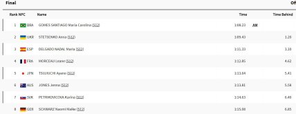 Перемогу у запливі здобула Марія Кароліна Гомес Сантьяго з Бразилії, а "бронза" дісталася Марії Дельгадо Надаль з Іспанії.