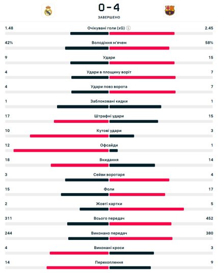 Зустріч на стадіоні "Сантьяго Бернабеу" завершилася з рахунком 4:0 на користь "Барселони". Про це повідомляє "Телеграф".