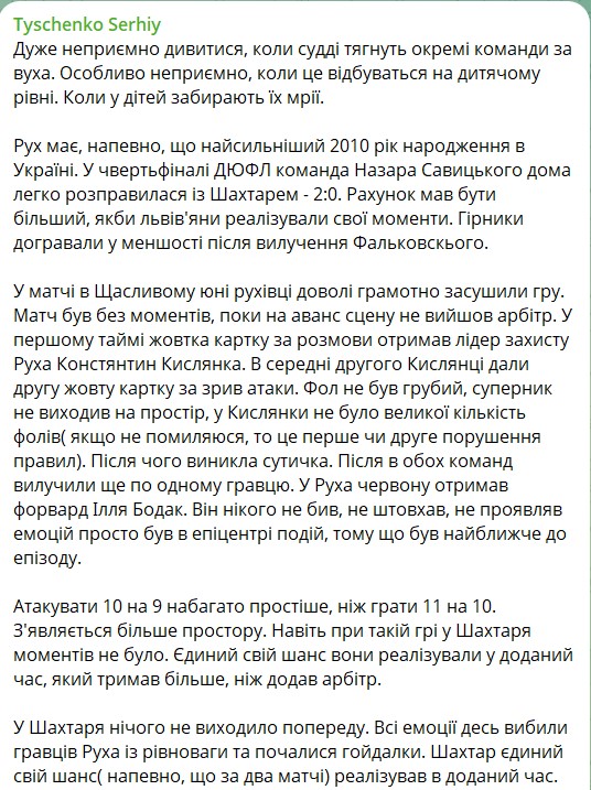 "Дуже неприємно дивитися, коли судді тягнуть окремі команди за вуха. Особливо неприємно, коли це відбувається на дитячому рівні. Коли у дітей забирають їхні мрії.