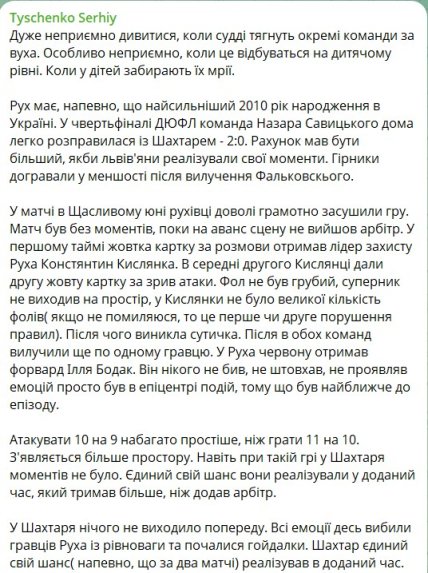 Так вбивають не Рух, так вбивають український футбол. Вбивають мрію, що у нас щось може бути по-чесному, що ці діти комусь потрібні… ", — заявив Тищенко.