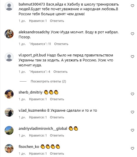 Цей пост викликав захоплення у росіян. Представники РФ запрошують Василя до себе. Крім того, дісталося чемпіону світу з боксу за версіями WBA, WBO, WBC та IBO у надважкій вазі, олімпійському чемпіону Олександру Усику (23-0, 14 КО). У коментарях під публікацією Усика називають "Юдою" та "зрадником".