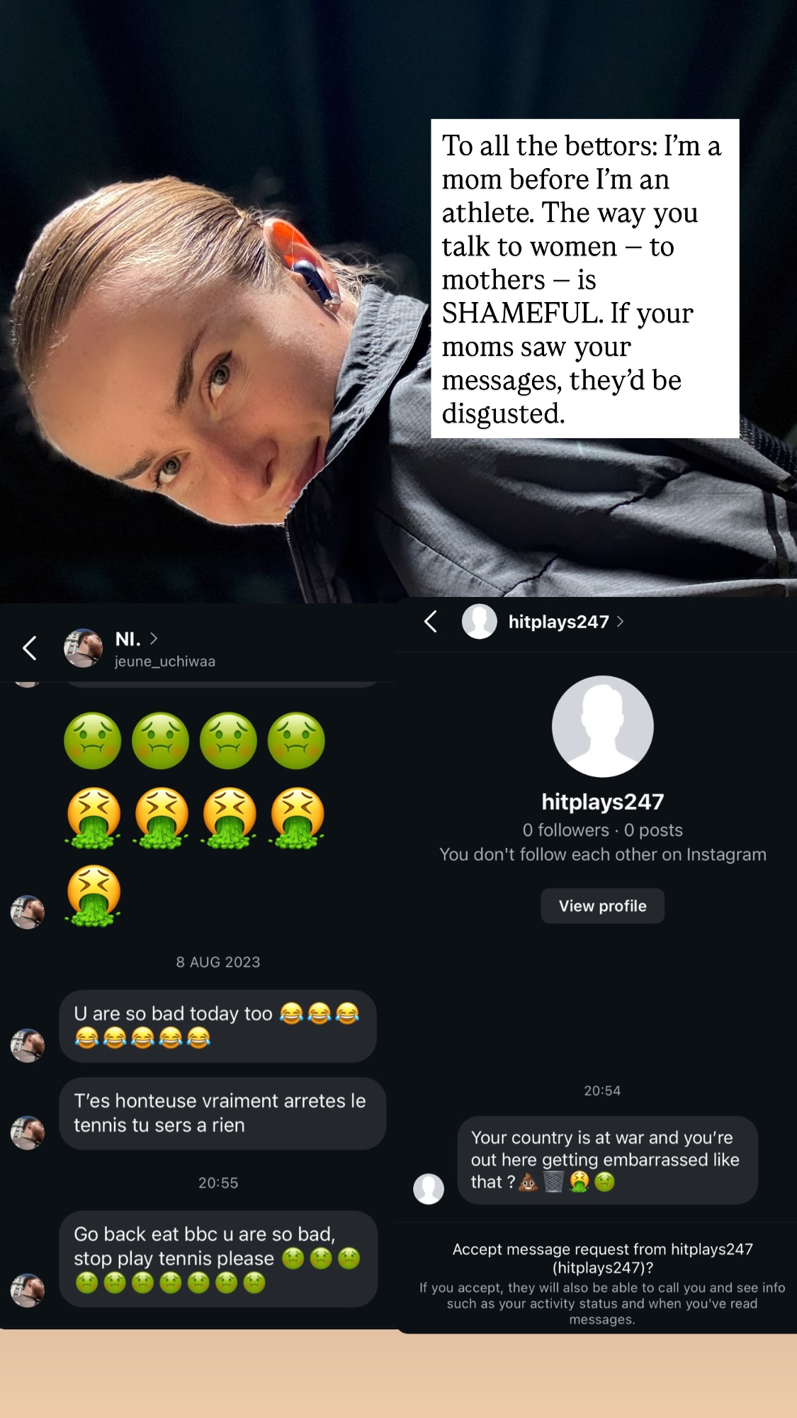 Про це розповіла сама тенісистка у сторіс на своїй сторінці в Instagram. Еліна присоромила хейтерів, наголосивши, що вона в першу чергу є матір’ю і лише потім — спортсменкою.