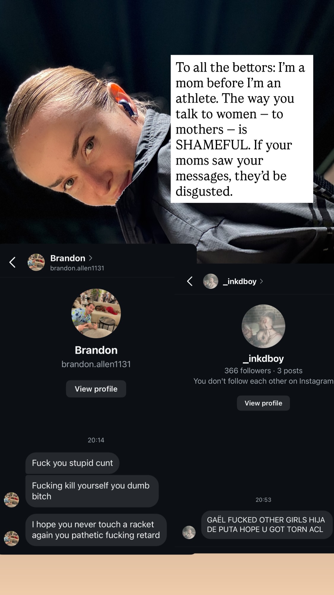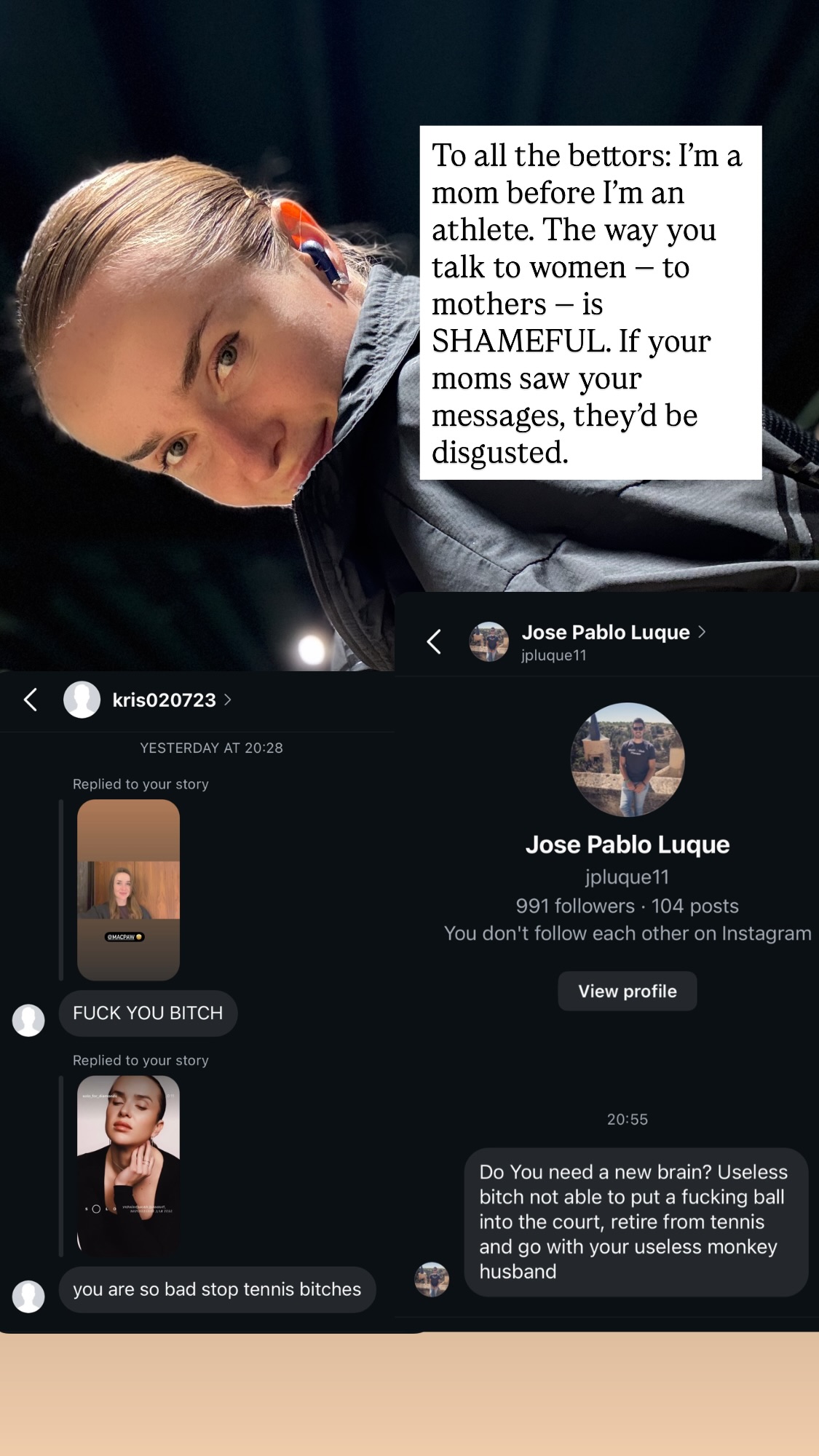 "Корумпована с**а. Карма повернеться, не переживай. Діти подякують тобі", "Не переживай, дочка ш***і. Рабиня корупції", "Сподіваюся, Росія уб’є всіх твоїх де**мових українців. Програла японці – повертайся смоктати ч**н"," е*****м м’ячем у корт.