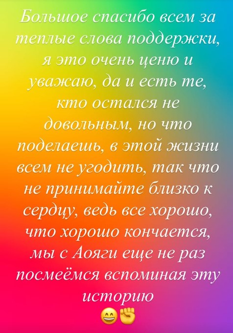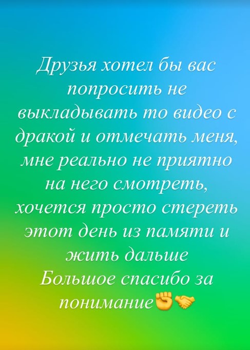 Те, що сталося на килимі, – я цим не пишаюся і нікого не закликаю до такого. Ви всі знаєте, що я миролюбна людина, і без вагомої на те причини не поводився б так. Своїми діями він образив мене і зачепив цим мою честь, що й спричинило такі наслідки. Адже будь-якого чоловіка, що поважає себе, таке зачепило б. Я не знаю, як вони до такого ставляться, але на Кавказі таке неприйнятно. Усім миру та добра.