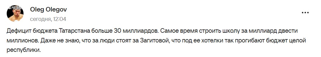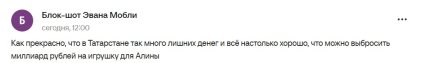 Примітно, що виконавець замовлення теж державне підприємство. У мережі вважають, що російські чиновники організовують "розпил" коштів. Ця новина викликала великий резонанс у Росії через дефіцит бюджету РФ. У мережі розкритикували чиновників, які виділили гроші на будівництво "іграшки" для Загітової.