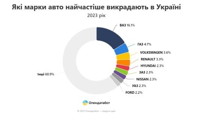 Серед викрадачів найпопулярнішою маркою авто є ВАЗ. За 2023 рік викрали понад 200 автомобілів цього виробника. На другому місці — ГАЗ, у п’ятірку антирейтингу також увійшли Volkswagen, Renault та Hyundai.