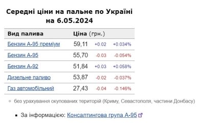 Бензин А-95 преміум продається в середньому за 59,11 грн за літр. Якщо обрати бензин А-95, ціна становить 55,70 грн за літр, а за бензин А-92 треба віддати 51,84 грн за літр. Для водіїв, які користуються дизельним пальним, наразі ціни в середньому складають 53,87 грн за літр. І, нарешті, для прихильників автогазу, його вартість становить близько 27,43 грн за літр.