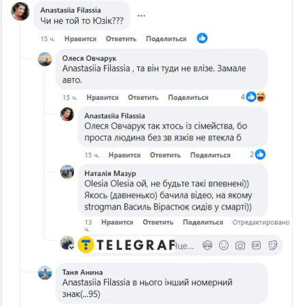 За свідченням очевидців, машина, водій якої залишив місце ДТП, мала номерні знаки "ЮЗИК". Коментатори висловили припущення, що за кермом міг бути народний депутат України Юрій Корявченков, більш відомий широкій публіці як "Юзік" — учасник студії "Квартал 95" та член партії "Слуга народу". Хоча інші стверджують, що в авто нардепа номерні знаки відрізняються.