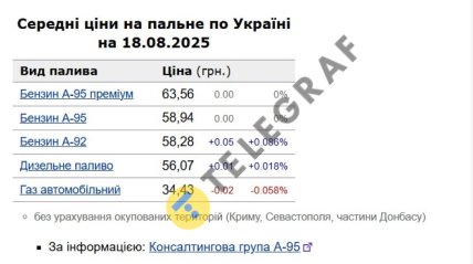 За даними сайту Мінфін, наразі ціни на пальне по Україні такі: бензин А-95 преміум можна придбати в середньому за 63, 56 грн за літ, А-95 коштує 58,94 грн за літр, А-92 майже так само — 58,28 грн. Дизельне паливо демонструє зростання у ціні — 56,07 грн за літр. Такий ж об'єм автогазу обійдеться українцям в 34,43 гривні за літр.