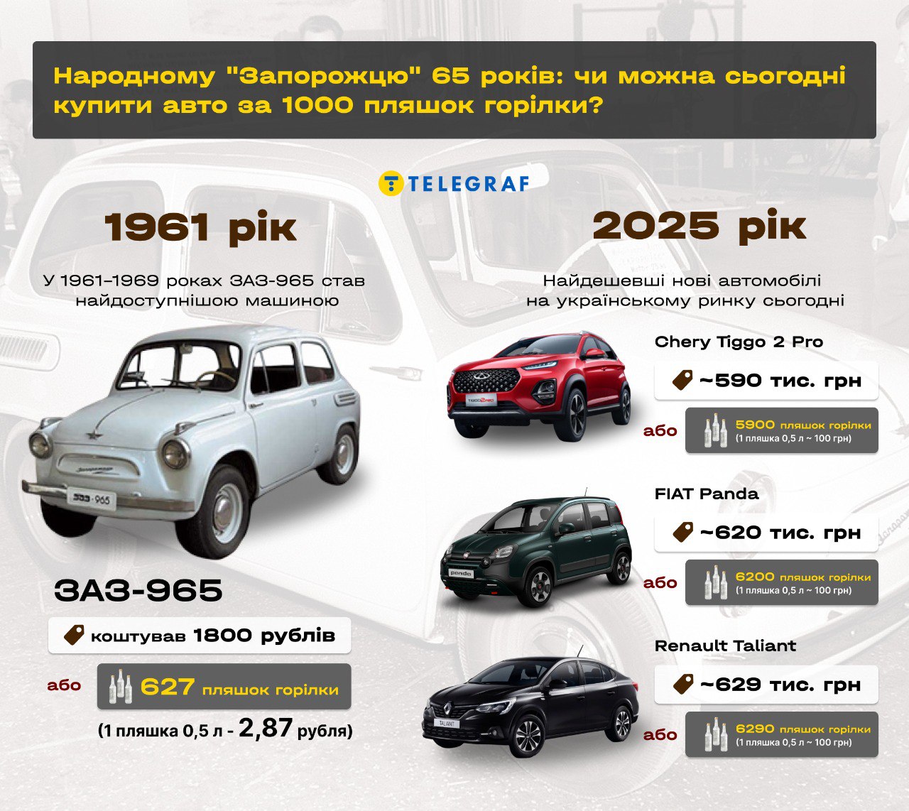 Один з найдешевших нових автомобілів на українському ринку сьогодні — китайський Chery Tiggo 2 Pro. На сайті офіційного дилера Chery Automobile Co. Ltd ціна починається від 590 тисяч гривень. Якщо поділити на вартість пляшки горілки, виходить 5900 пляшок. Майже в шість разів більше, ніж коштував "Запорожець" у той час.