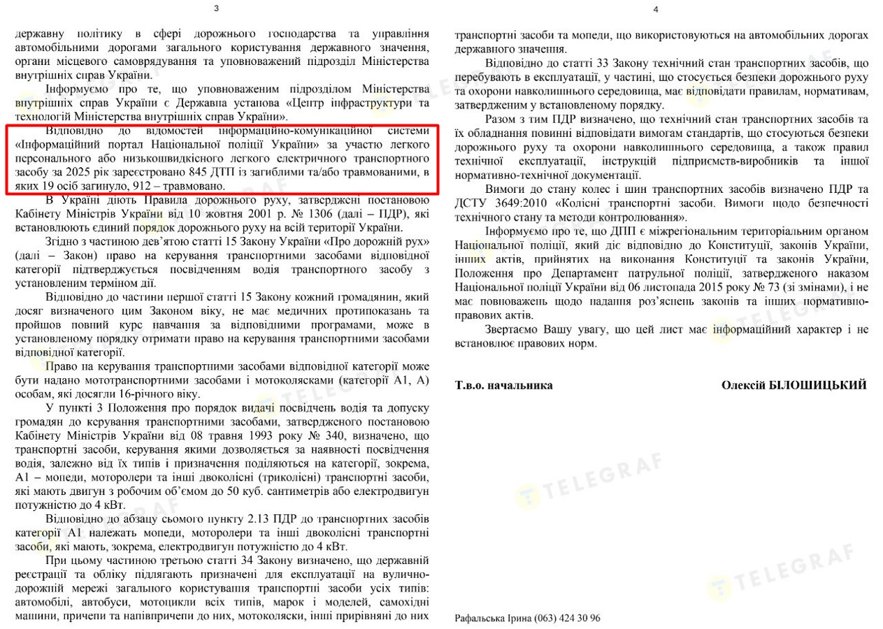 За минулий рік через електротранспорт загинуло 19 людей, ще 912 отримали травми. Про це "Телеграфу" стало відомо з відповіді Департаменту патрульної поліції на інформаційний запит. Загалом за 2025 рік зафіксували 845 дорожньо-транспортних пригод із загиблими та травмованими за участю електричних засобів пересування.