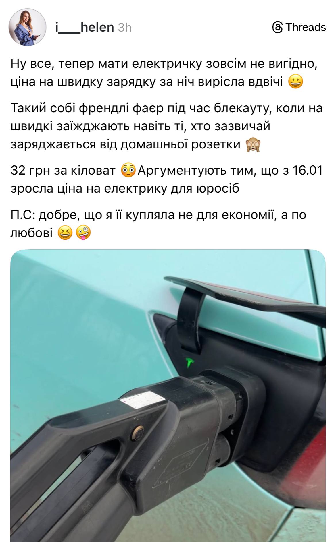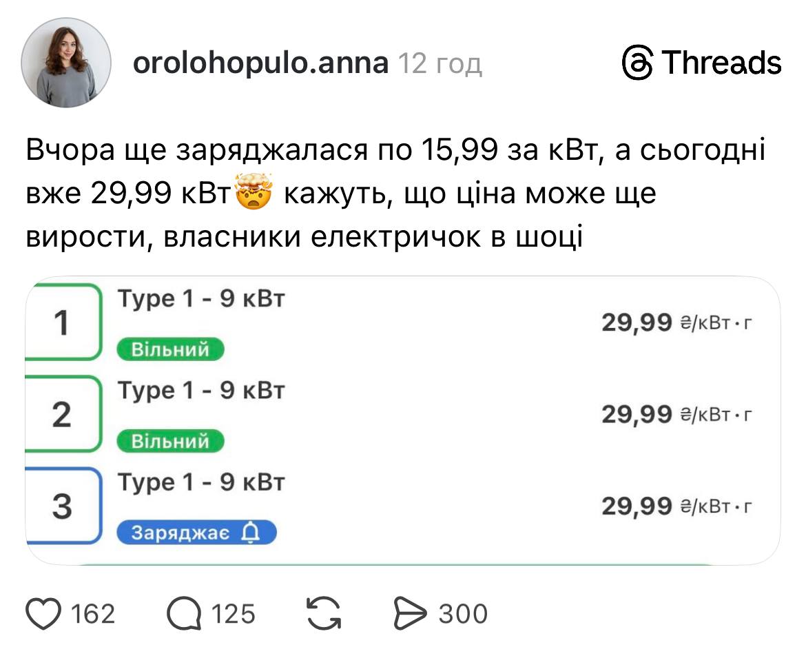 Якщо зайти в Threads, стрічка швидко наповнюється повідомленнями про різке подорожчання заряджання електромобілів на публічних станціях. Користувачі масово скаржаться, що ціни зросли майже вдвічі — з 15,99 грн за кВт до 29,99 грн за кВт, такі зміни, що сталися за ніч, явно стали неприємним сюрпризом для власників електрокарів.