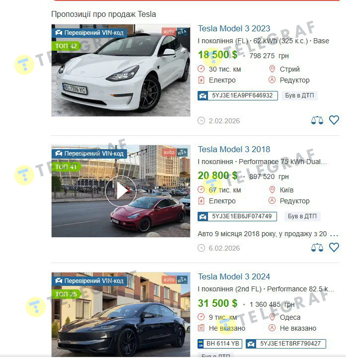 Якщо подивитись на окремі оголошення, можна побачити зниження цін на певні моделі. Наприклад, деякі Tesla окремих років подешевшали на 3-5%. Але це не обвал — це природне коректування ринку.