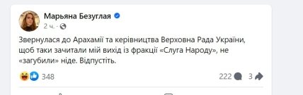 У вівторок, 6 лютого, вона написала у Facebook: "Звернулася до Арахамії та керівництва Верховна Рада України, щоб таки зачитали мій вихід із фракції "Слуга Народу", не "загубили" ніде. Відпустіть."