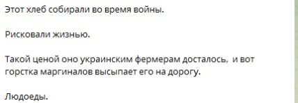 "Цей хліб збирали під час війни. Ризикували життям. Такою ціною воно українським фермерам дісталося, і ось жменька маргіналів висипає його на дорогу. Людожери", — йдеться у його повідомленні.