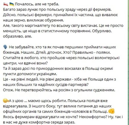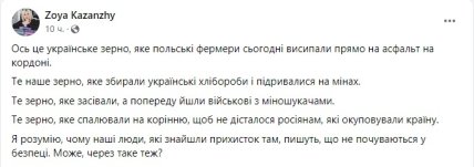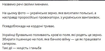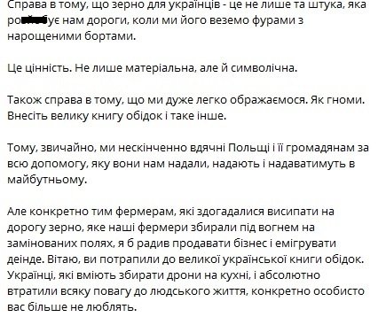"Але конкретно тим фермерам, які здогадалися висипати на дорогу зерно, яке наші фермери збирали під вогнем на замінованих полях, я б радив продавати бізнес і емігрувати деінде. Вітаю, ви потрапили до великої української книги обідок.", — каже він.